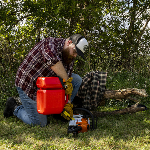 Store gasoline in the 1.5-gallon front fuel container, and store bar chain oil, sharpening files, and more in the attached back compartment.