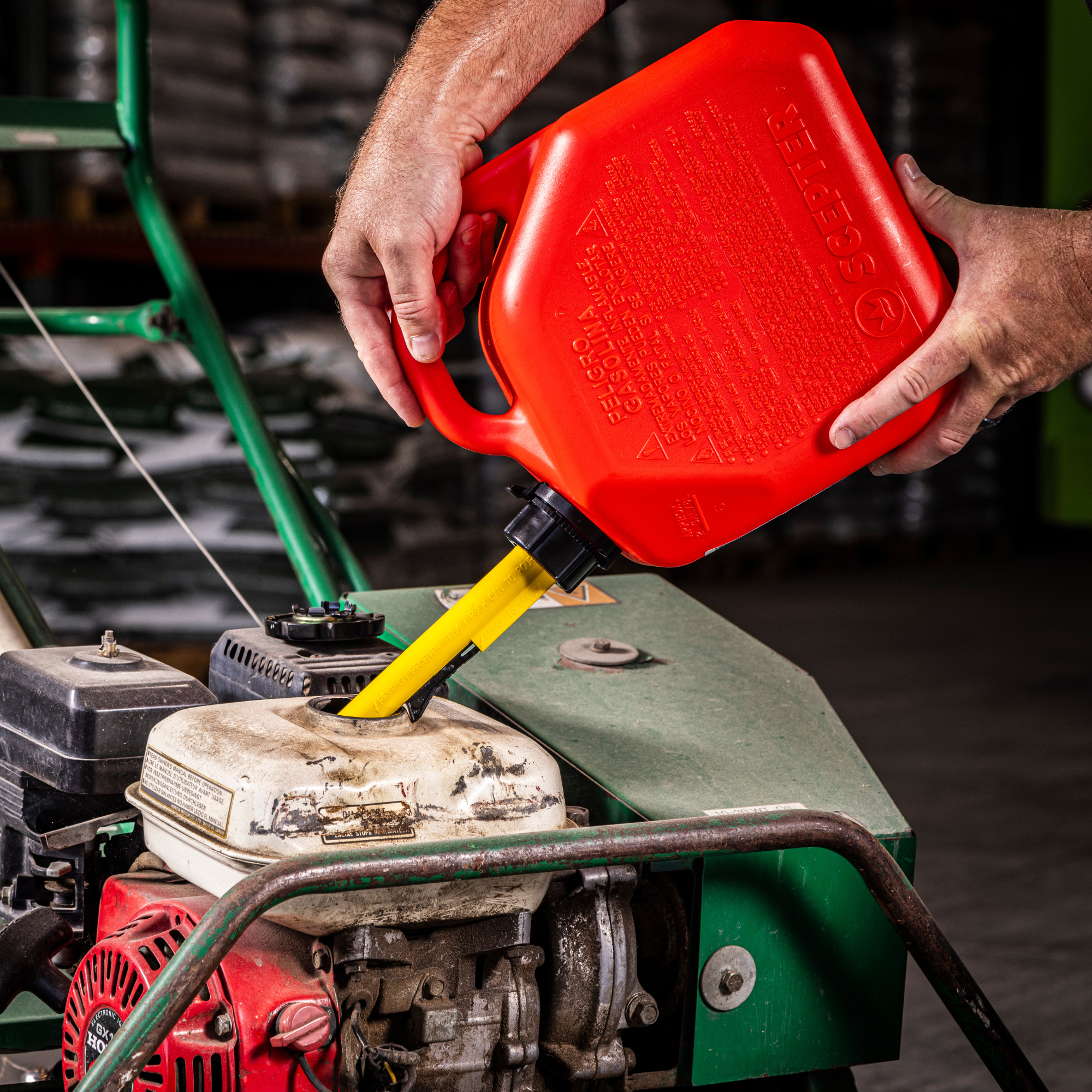 The wide base helps prevent tipping while the EasyFlo spout reduces emissions and automatically shuts off when you’re done!