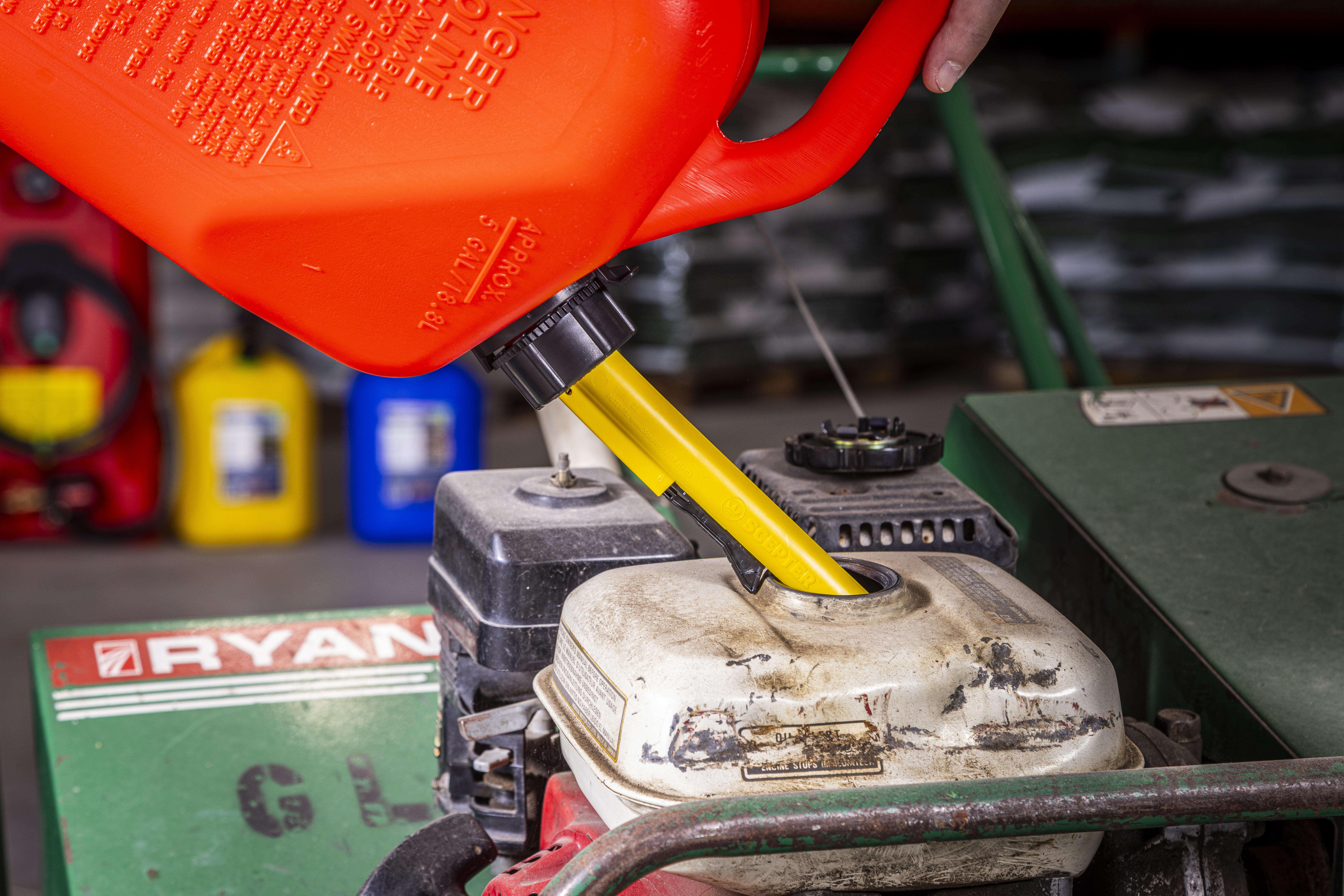 The wide base helps prevent tipping while the EasyFlo spout reduces emissions and automatically shuts off when you’re done!